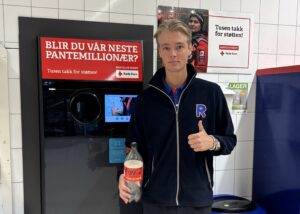 Henrik Bjørge Andersen på Rema 1000 Fanatorget gratulere den heldige kunden.