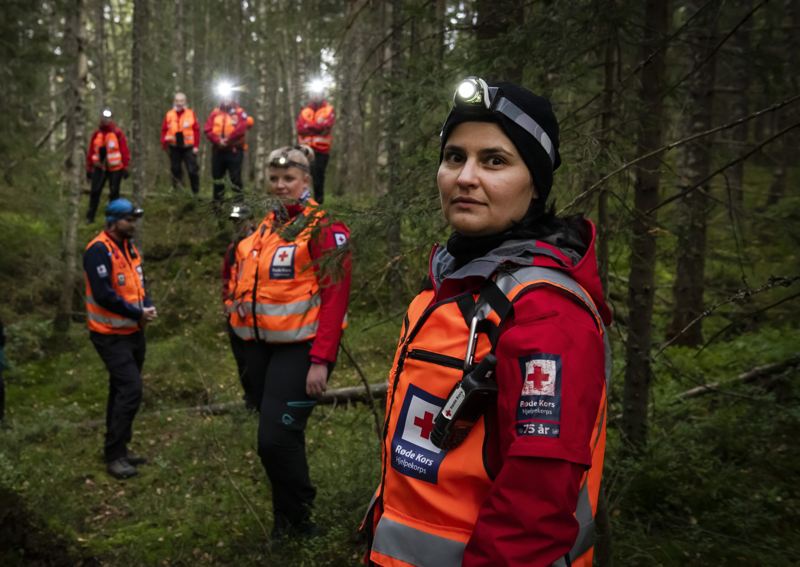 Røde Kors Hjelpekorps. Oslo Røde Kors Hjelpekorps. Søk og redning. Skog. Frivillige. Natt. Mørkt. Hodelykt. Illustrasjonsbilde. (Foto: Katrine Lunke / APELAND)