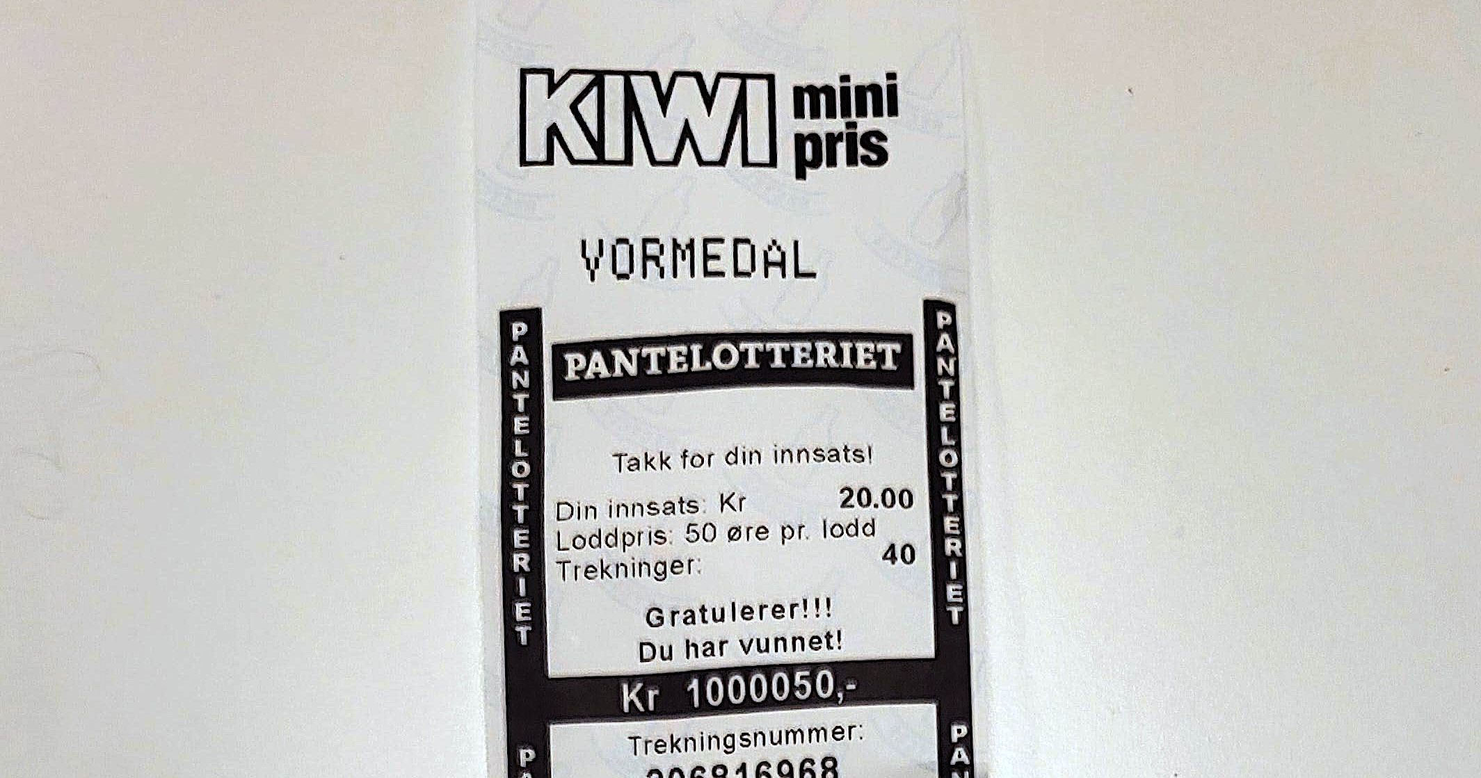 Pantelappen på Kiwi viste seg å være verdt utrolige én million kroner. Foto: Privat