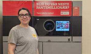 Lina Gran på Coop Prix Fjellvang gleder seg over en pantemillionær i butikken sin. Foto: Privat